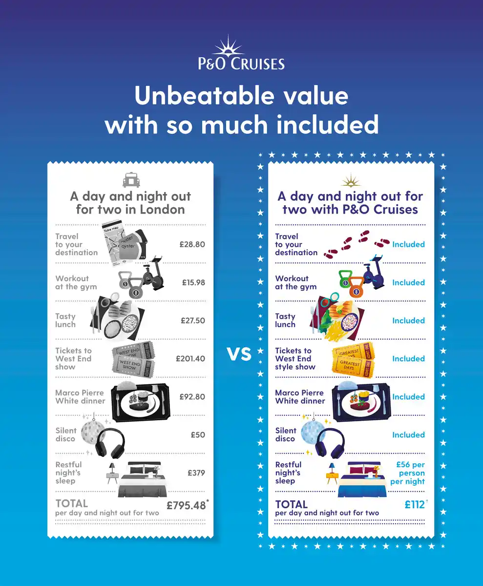 Here we’ve broken down the price of a typical P&O Cruises holiday and what you get for your money when it comes to accommodation, dining, entertainment and other experiences versus a typical land-based equivalent.