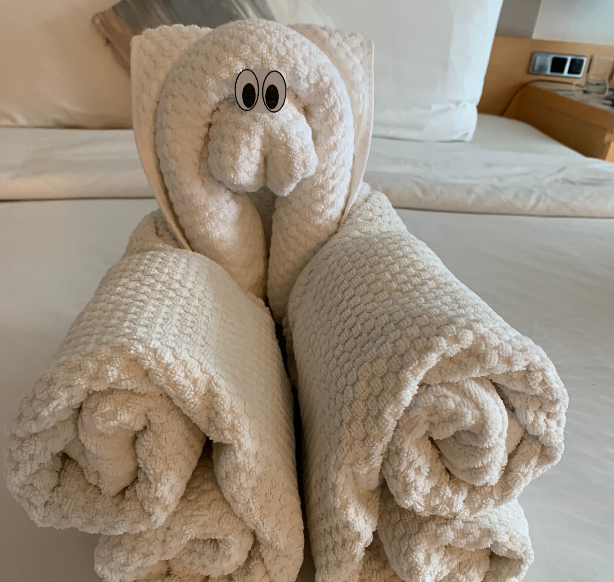 We were on Marella Explorer 2, a ship built in 1995 and in this fleet since 2019. Our junior suite was on deck 12, aft, starboard and had a huge balcony with two loungers, a table and chairs. The cabin had a bath with a shower attachment and many cupboards and shelves. No complaints whatsoever and worth every penny. As is common, the animal shapes our stewards made from our towels didn’t fail to surprise and delight us.