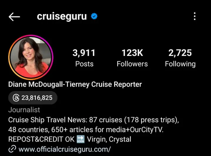 And finally, we have the Cruise Guru, Diane McDougall-Tierney. A Canadian travel reporter, throughout the years, Diane has been on 87 cruises and has visited 48 different countries. Alongside boasting a popular blog and YouTube channel, Diane has a thriving Instagram account in which she posts exterior cruise ship videos, videos showcasing particular areas of the cruise ship she’s staying on, cruise ship reviews, news and more.