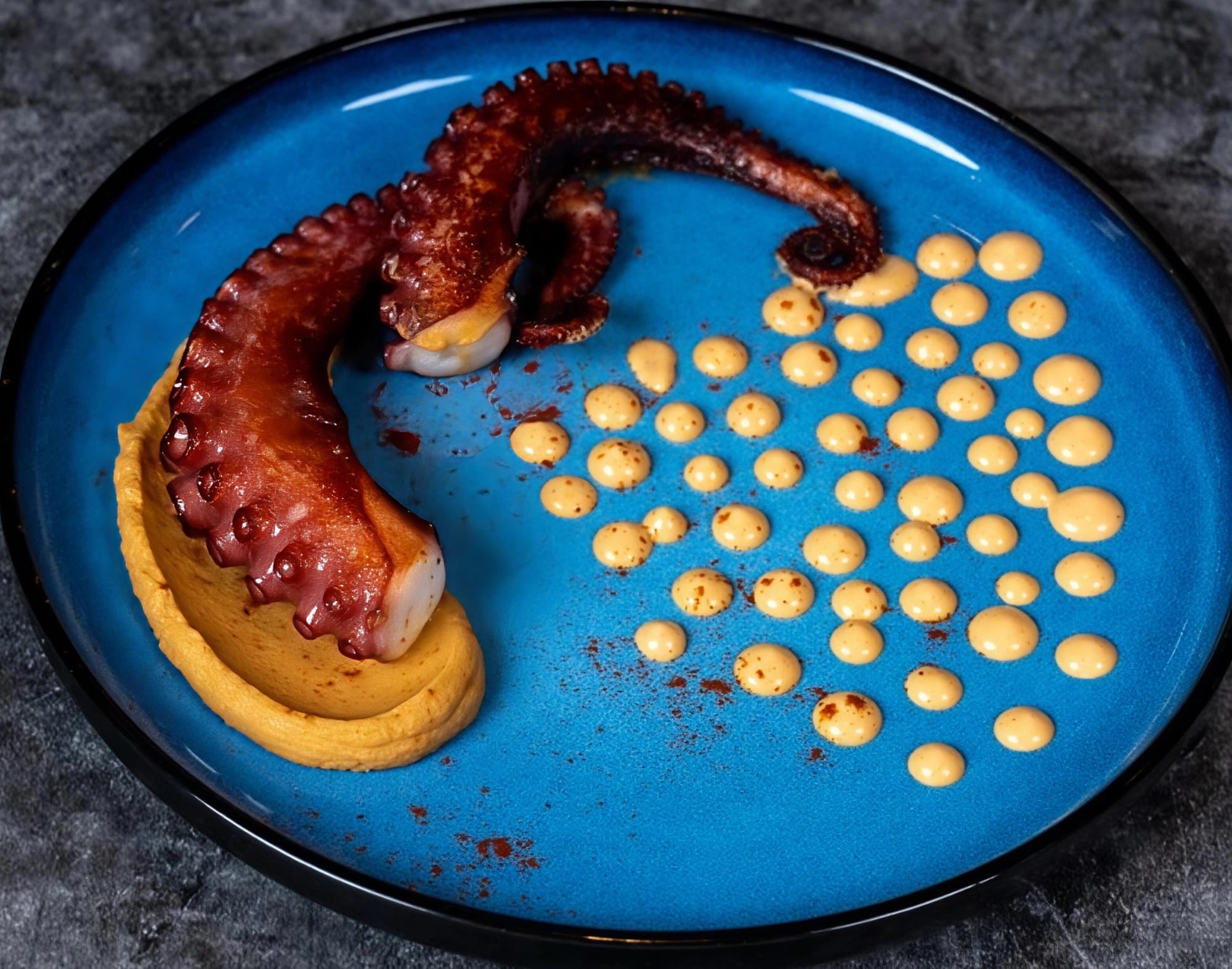 - Argentinian red prawns with a curry chickpea puree and chilli oil