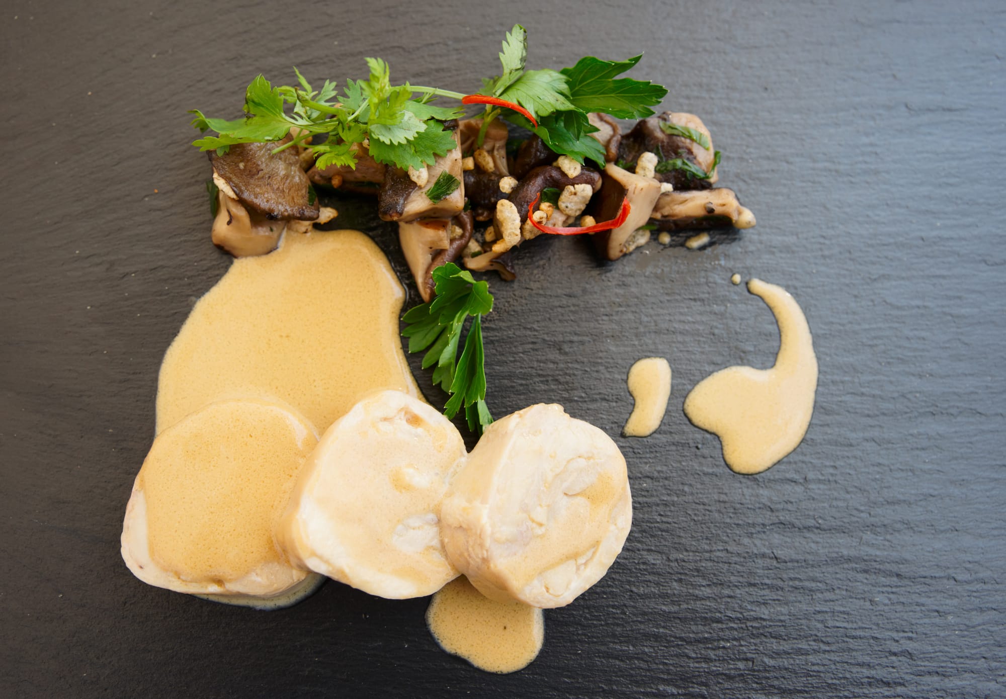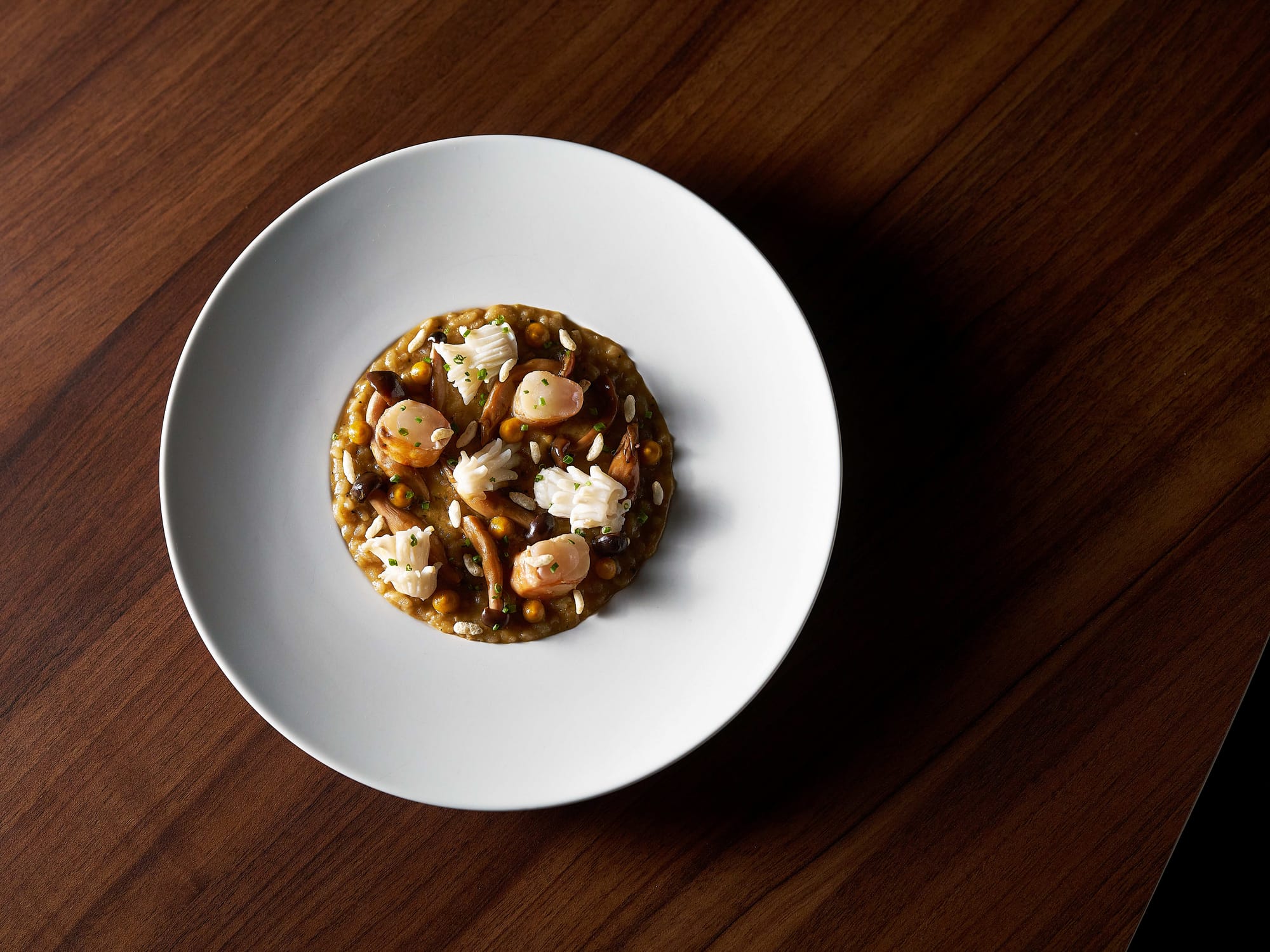 - Seared scallops in a seafood bisque inspired by the Malay Peninsula