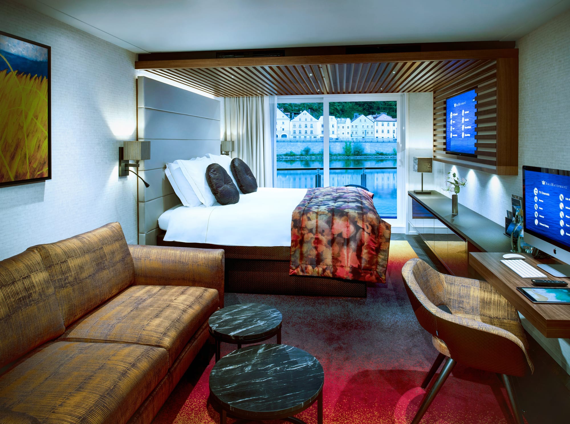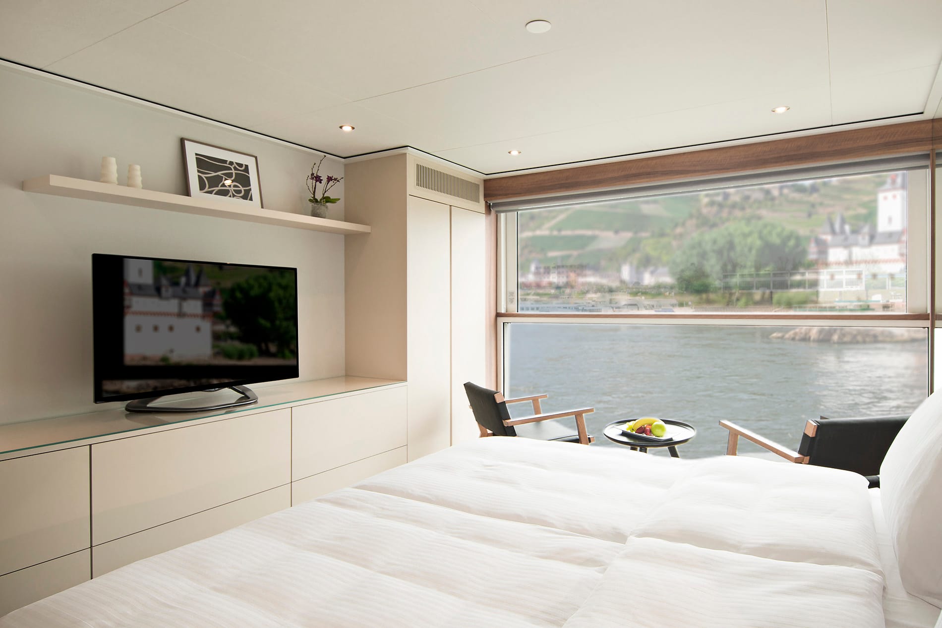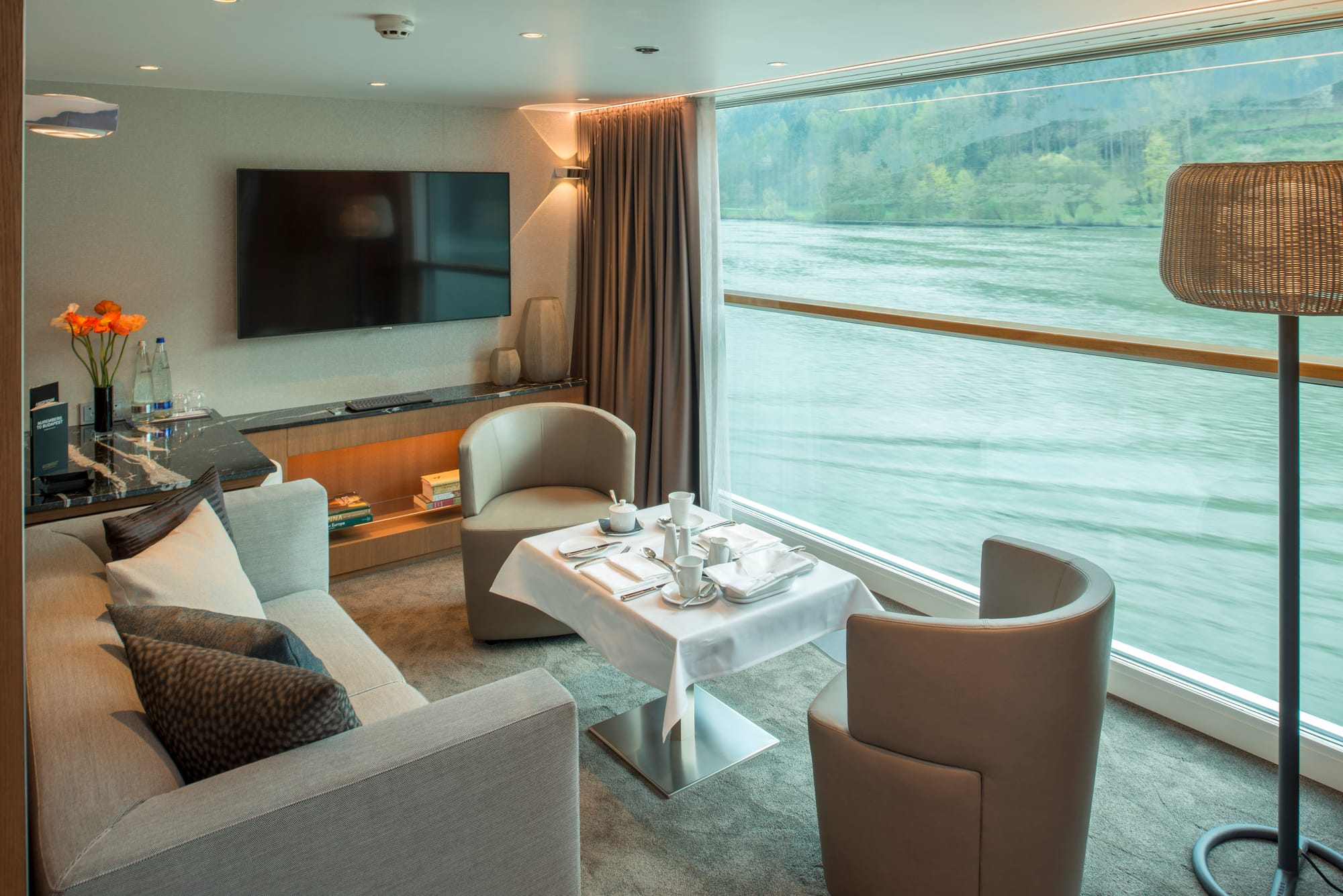 An impressive range of accommodation options awaits you aboard Emerald River Cruises’ ships, with every stateroom and suite offering simple elegance and a range of amenities that ensure you’ll always have a comfortable getaway. Those amenities, available in every accommodation, include a stylish en-suite bathroom with ESPA luxury toiletries, a flat-screen TV with a custom infotainment system, luscious linens, and a small seating area. You’ll also have access to climate control, bottled water that’s restocked daily, walking poles and an umbrella to use on shore excursions, and a mini-bar – though the drinks here are at your expense and not included.