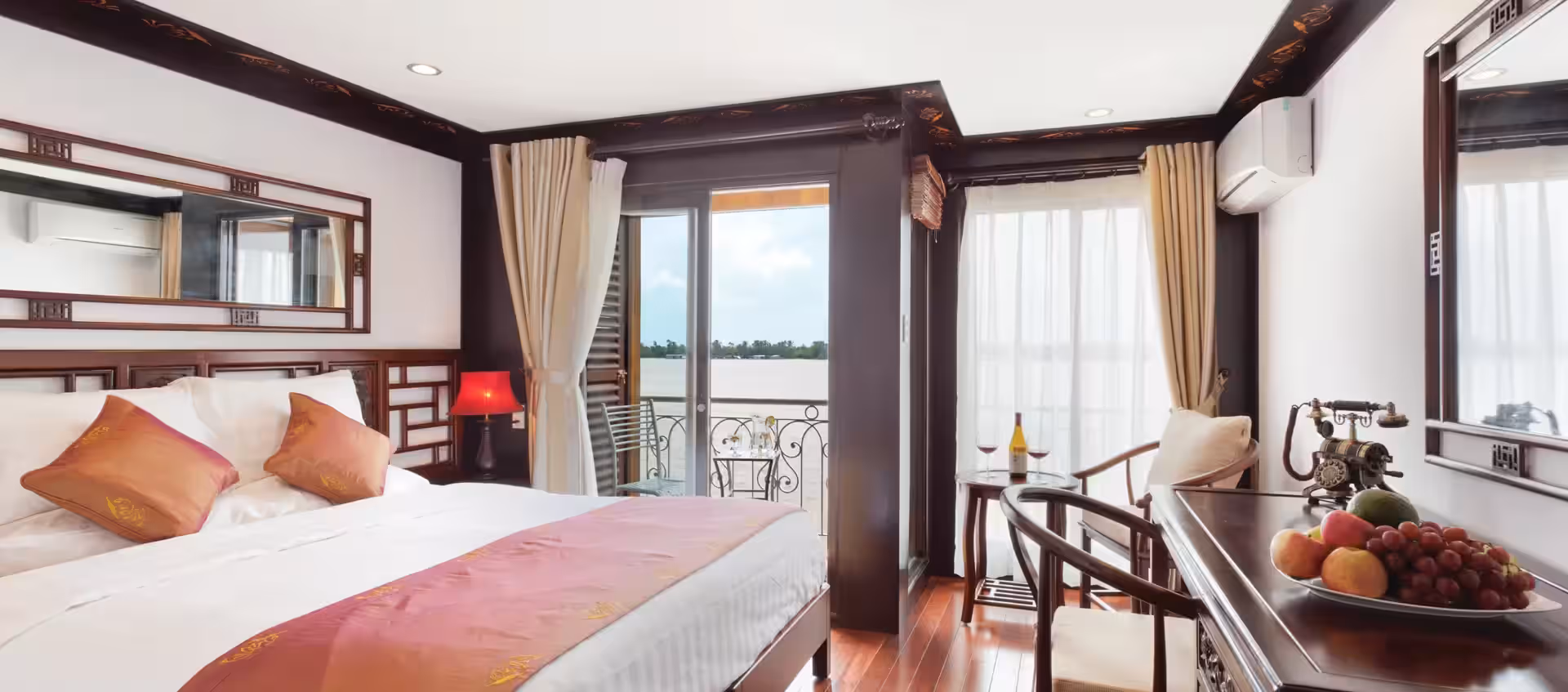 Beyond this, you’ll find that Standard Suites on the lower decks feature wide picture windows letting in ample natural light, while suites elsewhere boast a Scenic Sun Lounge: a hybrid space that combines French-style balconies with a protected outside space, providing you with fresh air and panoramic views anytime. The Royal Panorama Suites on Scenic Spirit take this one step further, also boasting an expansive lounge area and an outdoor jacuzzi to soak in while sailing along Southeast Asia’s Mekong River.