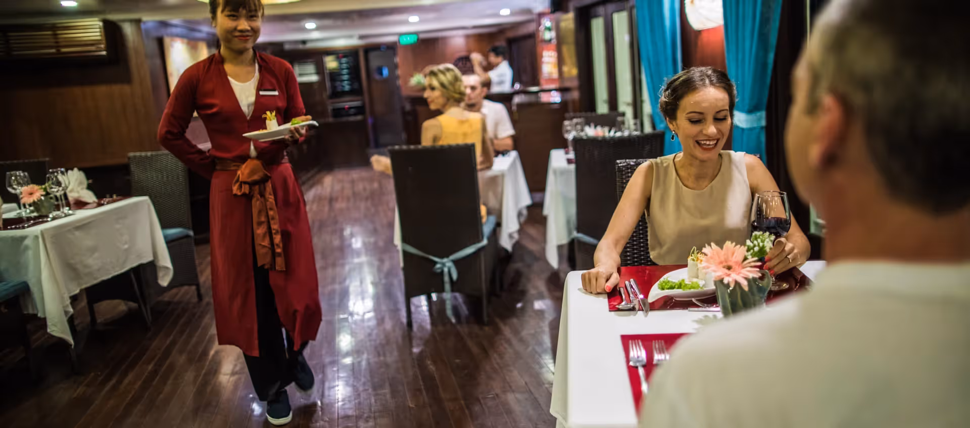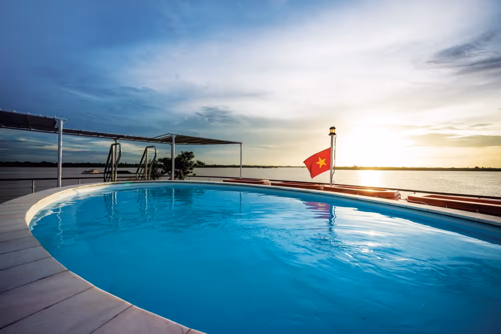 Emerald Harmony, Emerald River Cruises’ ship sailing in Southeast Asia, is a little different. You’ll still find Reflections Restaurant and Horizon Lounge & Bar onboard, but they will feature destination-inspired interior decor. This ship also features a second, smaller lounge area for guests to enjoy throughout the day and into the evening. Emerald Harmony’s swimming pool area is also open-air, without a retractable glass roof, and does not transform into a small cinema venue in the evenings.