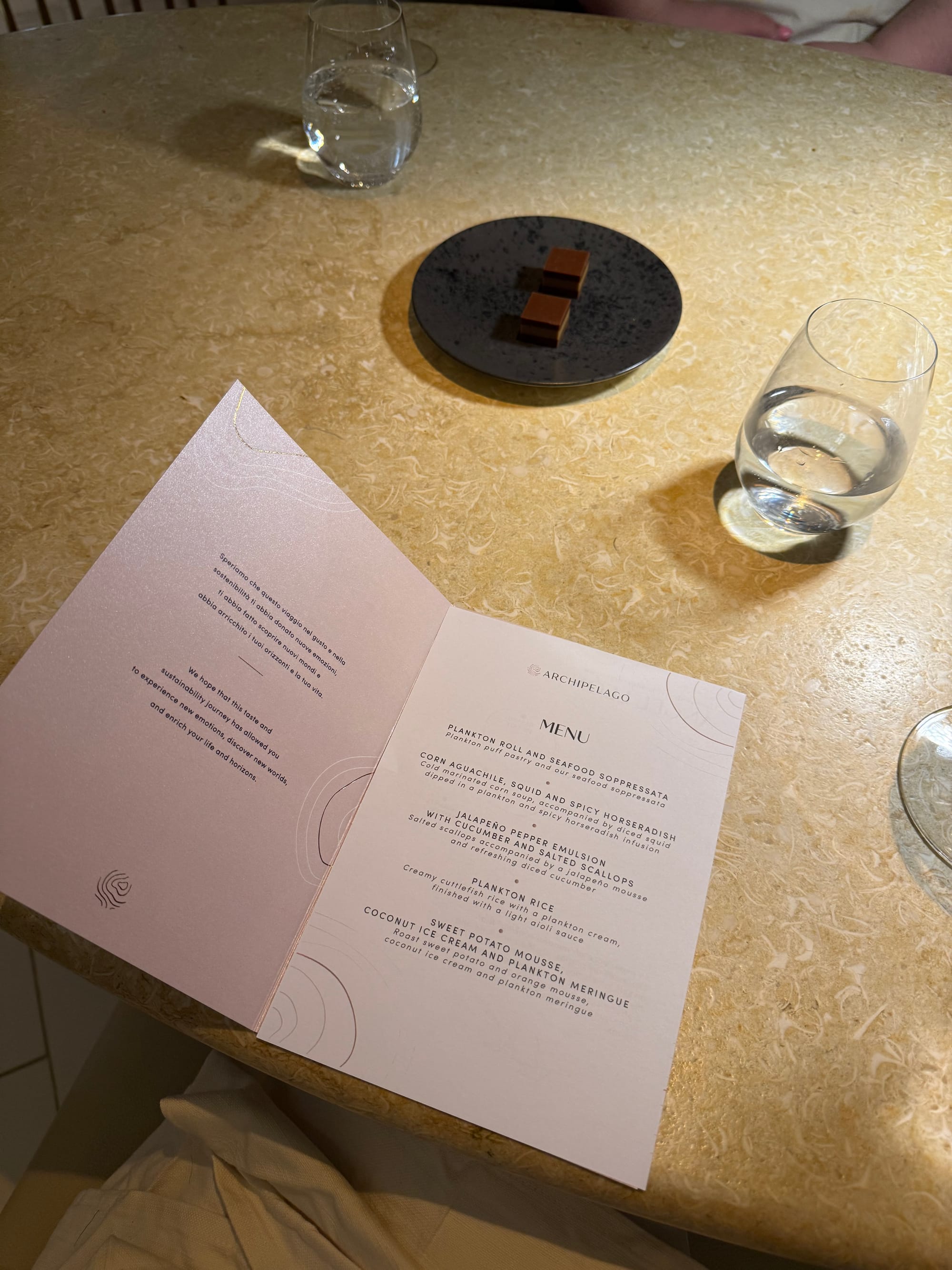 Another memorable experience was Archipelago, where myself and another colleague tried two different tasting menus created by different chefs. The service here felt very luxurious, with the waiter explaining each of the five courses and wine pairings. The atmosphere felt calm and elegant, almost like dining in a high-end restaurant or spa setting. I did notice that the portion sizes on the menu I selected were smaller than my colleague’s, so the value for the upcharge could vary depending on the menu choice, but the quality of the food and service was still excellent.