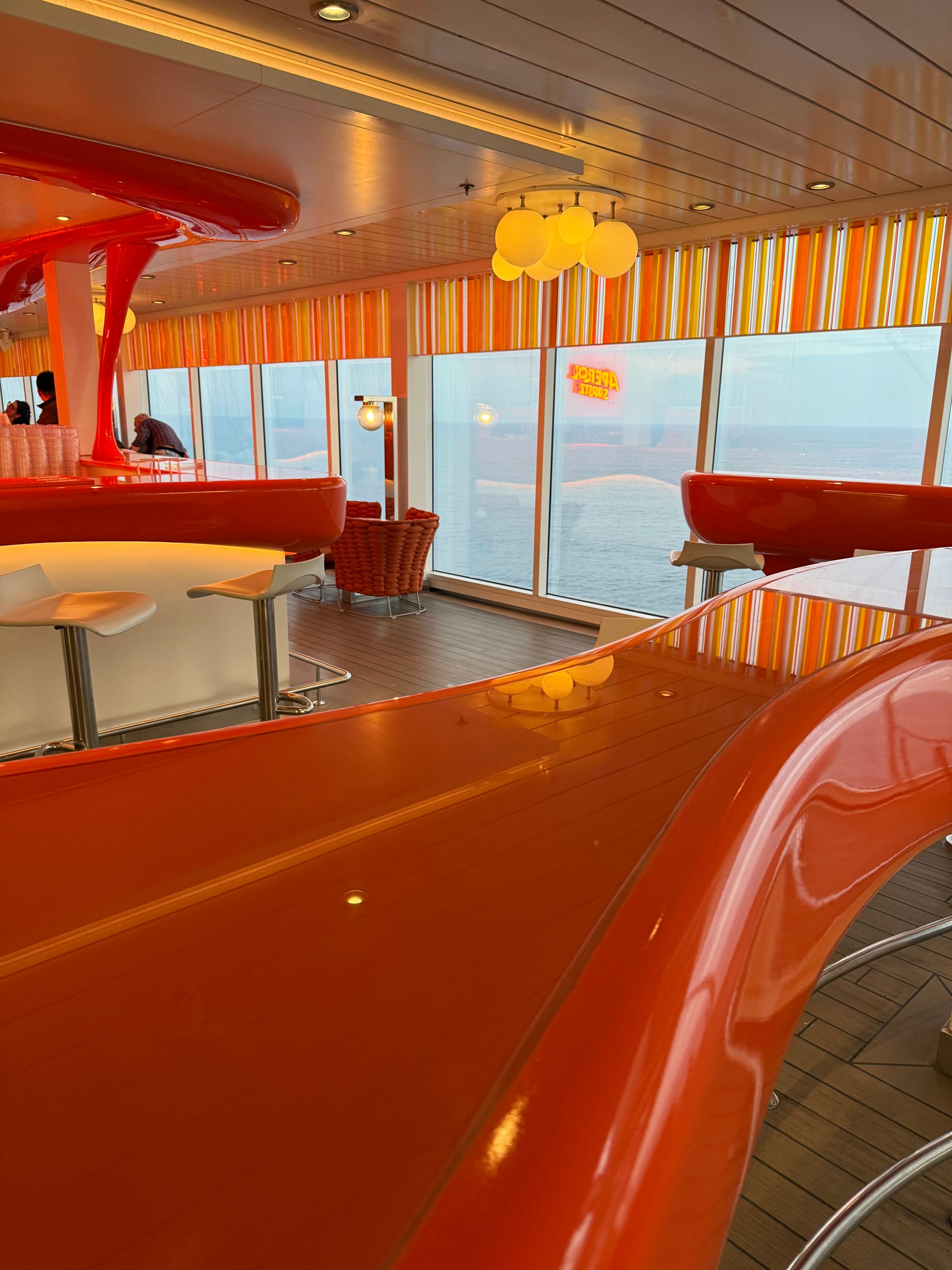 The Aperol Spritz Bar was one of the most vibrant and social spots onboard. It had a great atmosphere and was the perfect place to enjoy a drink before dinner or while watching the sunset. The lively Italian feel really added to the experience and made it a great place to meet other guests and enjoy the cruise atmosphere and get in the holiday feel it is hard to find and outside so easy to miss but one of my favourite features the decor is also amazing and further up the sunset swings as the cruise sails away is totally unique, special area!